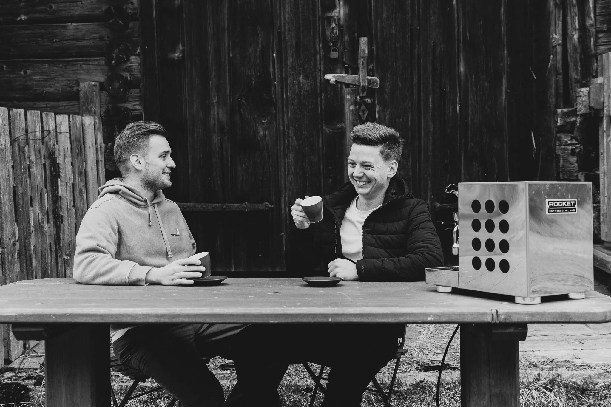 Zwei Männer sitzen an einem Holztisch im Freien, trinken Kaffee und lachen. Neben ihnen steht eine Espressomaschine der Marke Rocket auf dem Tisch. Im Hintergrund ist eine Holzwand zu sehen.